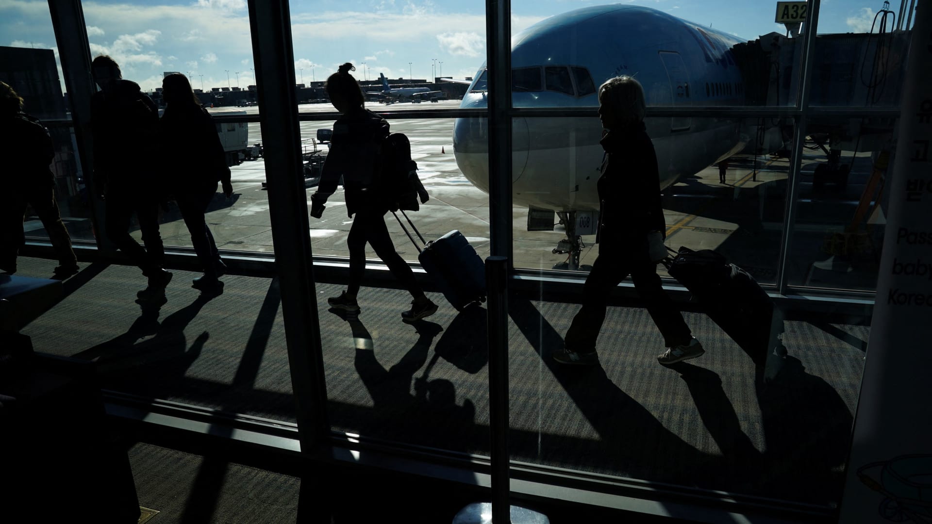 Passengers make their way through the terminal as they travel ahead of the Thanksgiving holiday at Washington Dulles International Airport in Dulles, Virginia, on Nov. 22, 2023.