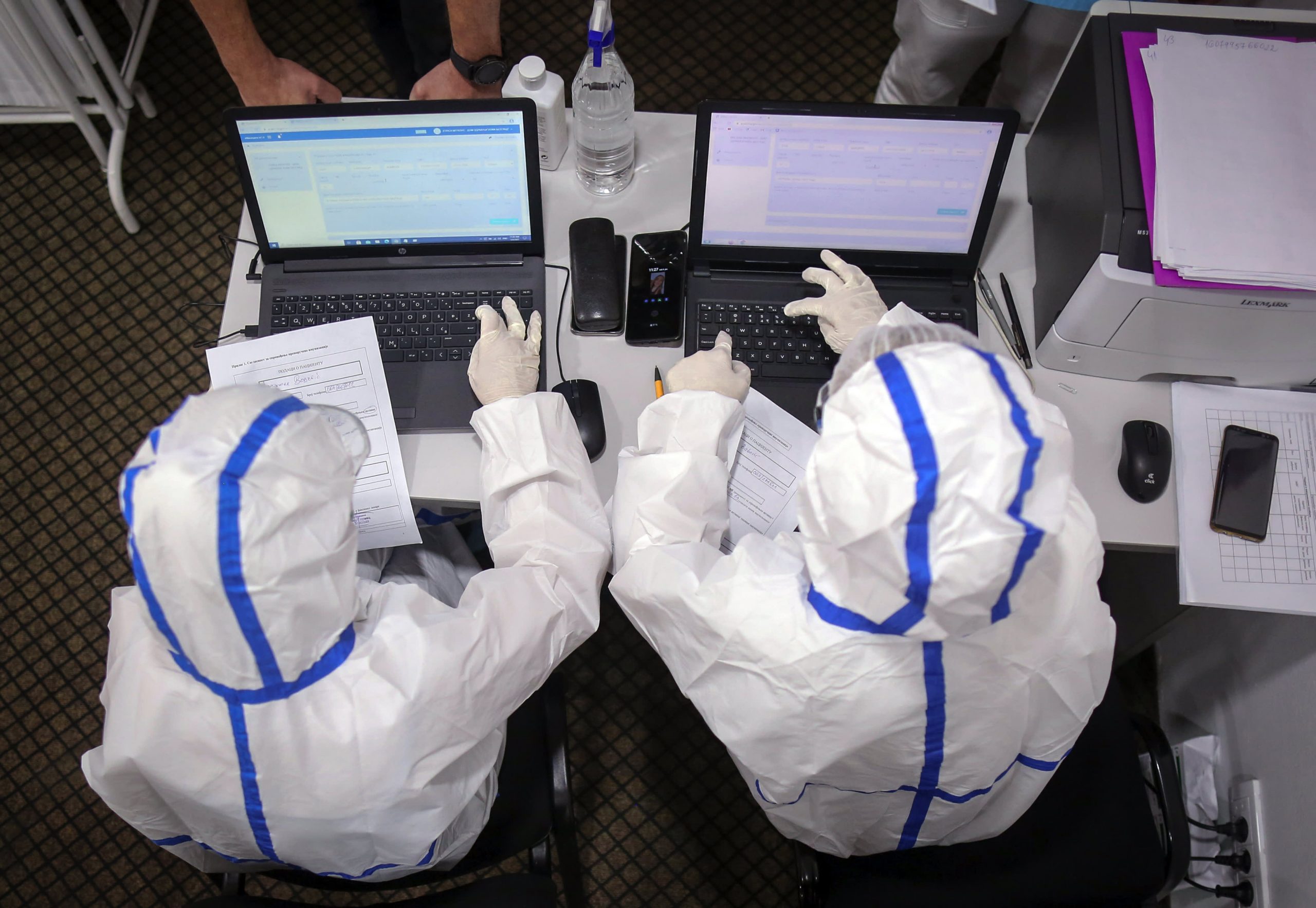 Health care workers enter visitor information on laptops before administering doses of Pfizer-BioNTech Covid-19 vaccine on Sunday, January 10, 2021 at the Mother and Child Hospital in Belgrade, Serbia.
