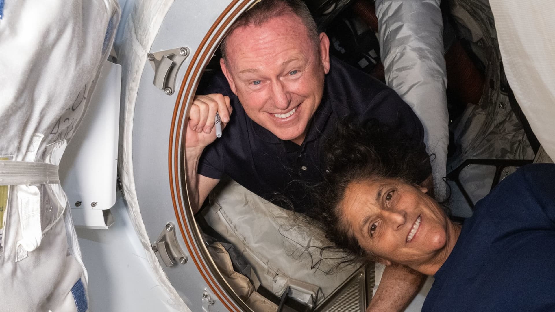 NASA astronauts Butch Wilmore (left) and Suni Williams pose in the hatch that connects Boeing's Starliner to the International Space Station.
