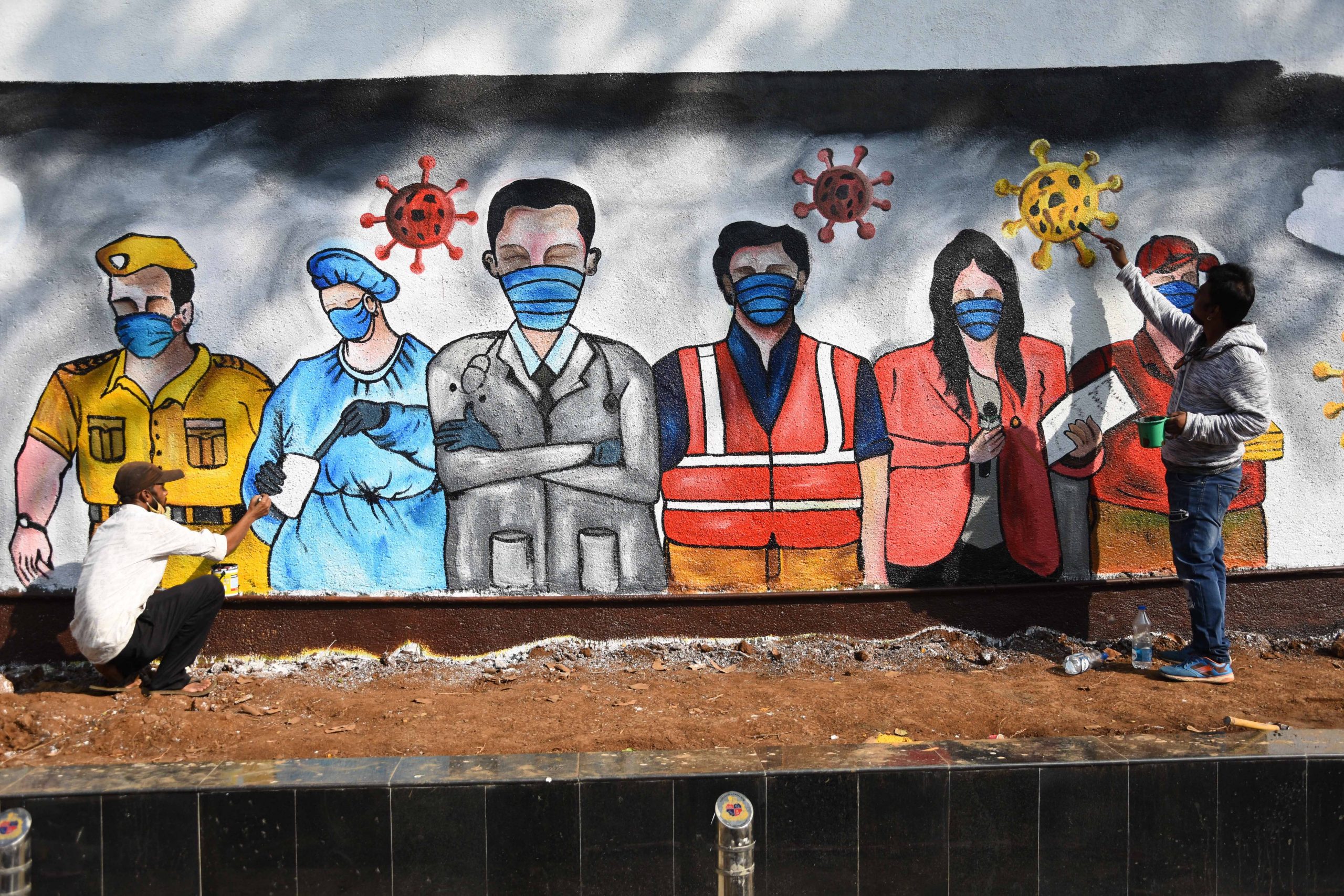 Two men paint graffiti by frontline workers on a wall during the coronavirus pandemic in Mumbai, India.