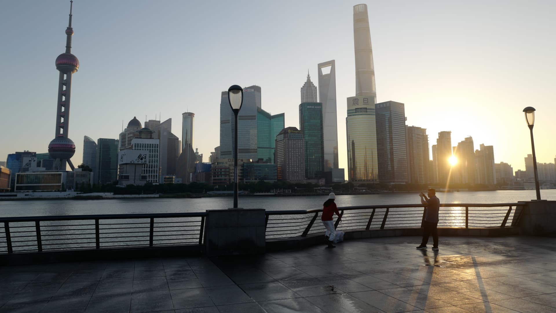 Sunrise around the Bund River District on November 02, 2023 in Shanghai, China.