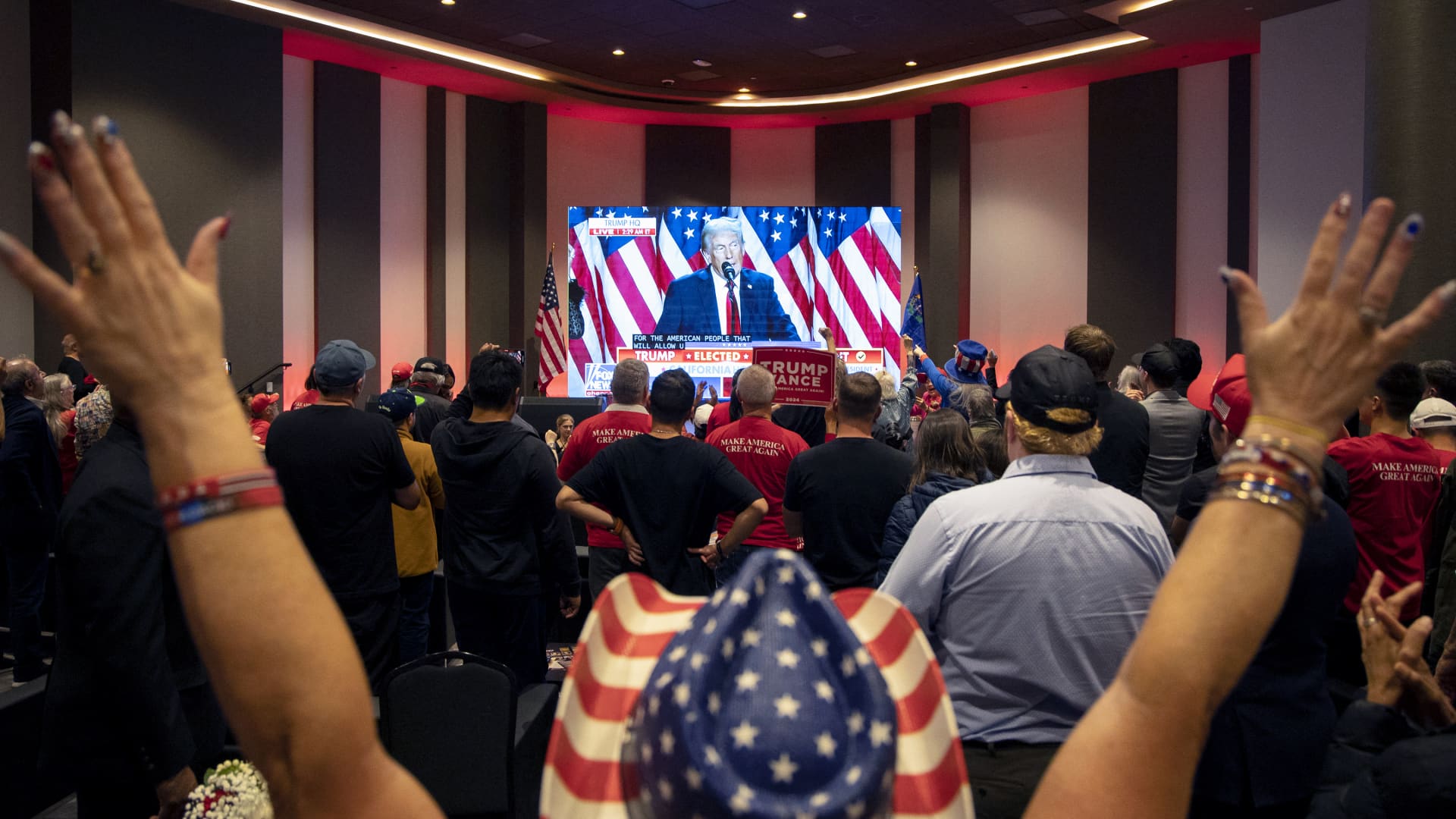 Attendees cheer as a screen shows a broadcast of former U.S. President and Republican presidential candidate Donald Trum's speech at his election party in Florida on November 6, 2024, at the Nevada GOP election watch party in Las Vegas, Nevada, November 6, 2024.