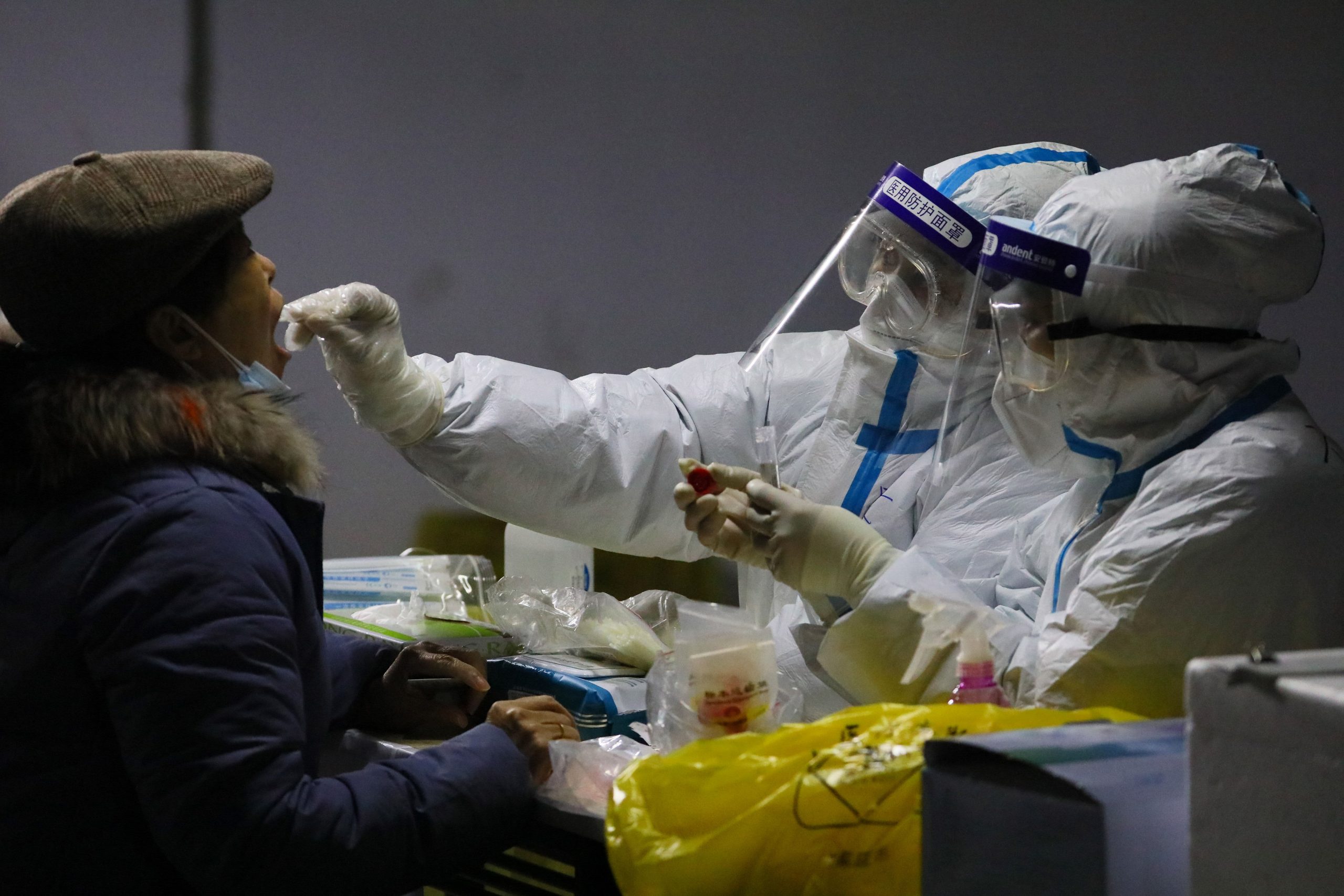 A resident is undergoing a Covid-19 coronavirus test as part of a mass test program in the basement of a residential area after new cases of the virus emerged on January 12, 2021 in Shijiazhuang, central China’s Hebei Province.