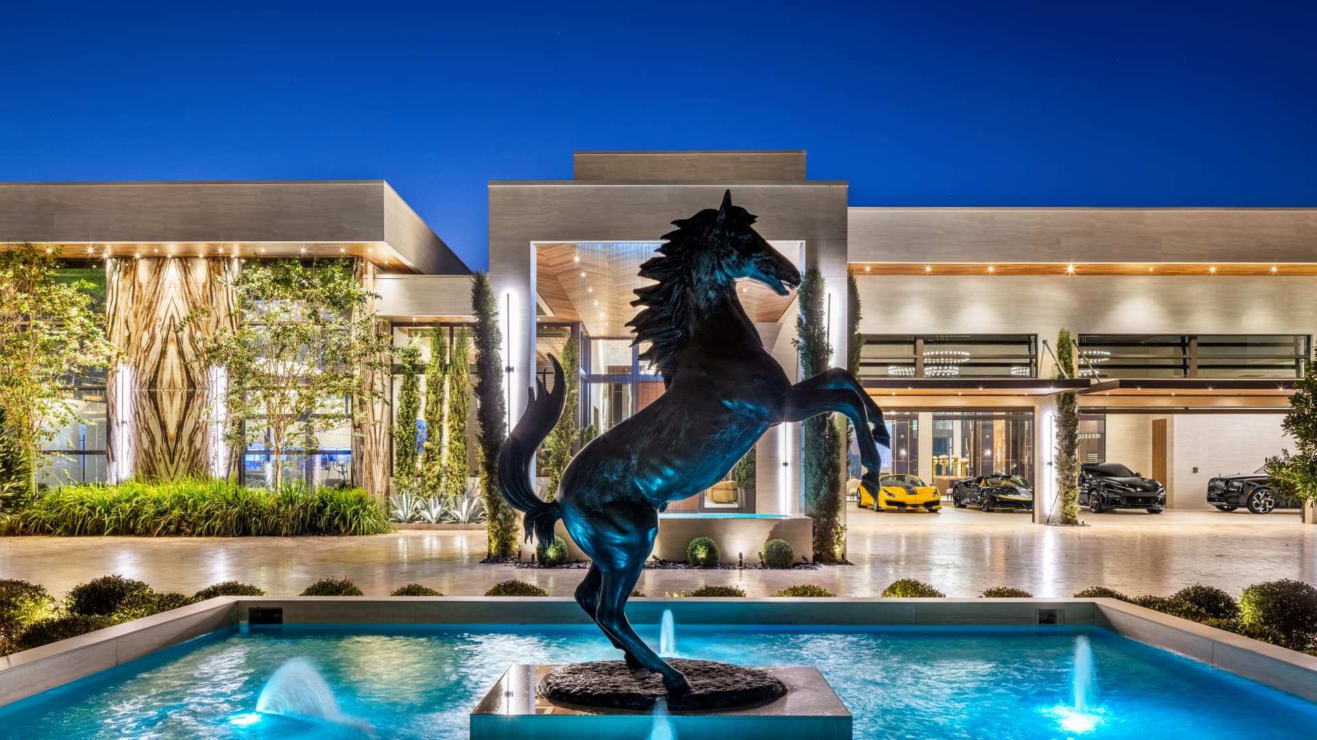 The architecture of the almost 22,000 square meter megahome inspired Italian automobile manufacturer, including a well on the front trip with a dancing bronze horse, which is reminiscent of Ferrari's legendary logo.