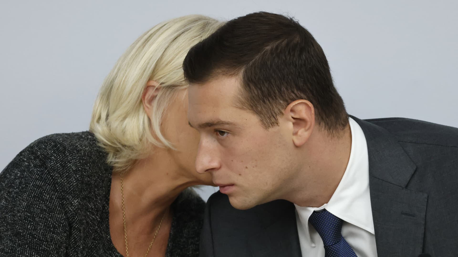 Marine Le Pen (L), President of the Rassemblement National (Rassemblement National) parliamentary group, speaks with President and leading MEP Jordan Bardella during the parliamentary seminar of the far-right French party Rassemblement National (National Rally) RN at the French National Assembly on September 14, 2024 in Paris.