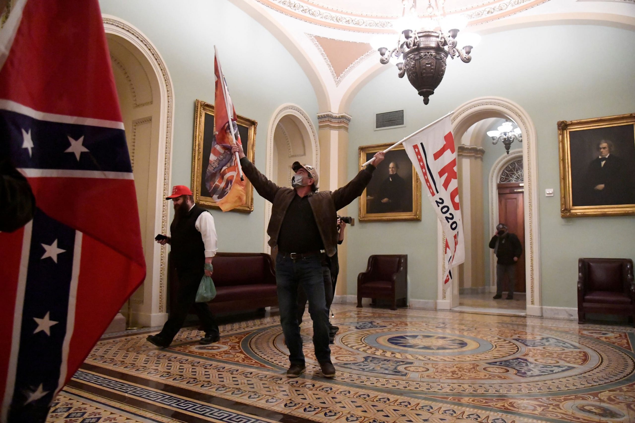 Supporters of US President Donald Trump wave Trump flags and Confederate battle flags as they demonstrate on January 6, 2021 in Washington, USA, on the second floor of the US Capitol near the entrance to the Senate, after breaching security .