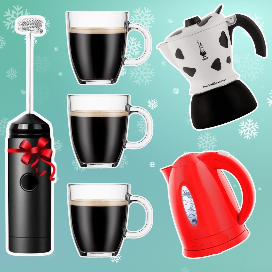 From a luxe espresso machine that features accessories to make delicious espressos, cappuccinos, and lattes, to a matcha starter kit with matcha latte mix, these gift recs are ideal for novices, snobs, aficionados, and beginners alike. Tea drinkers can appreciate a convenient electric kettle that heats water in just six minutes, and classic joe indulgers can enjoy a coffee and chocolate tasting box. At-home baristas can rejoice in TikTok-famous cup and straw sets, Insta-worthy latte foam art kits, and holiday-inspired syrups, while those on-the-go java lovers can appreciate a travel tumbler with 97,000+ 5-star reviews on Amazon or a portable espresso machine that can make drinks anywhere. No caffeine stone has been left unturned.