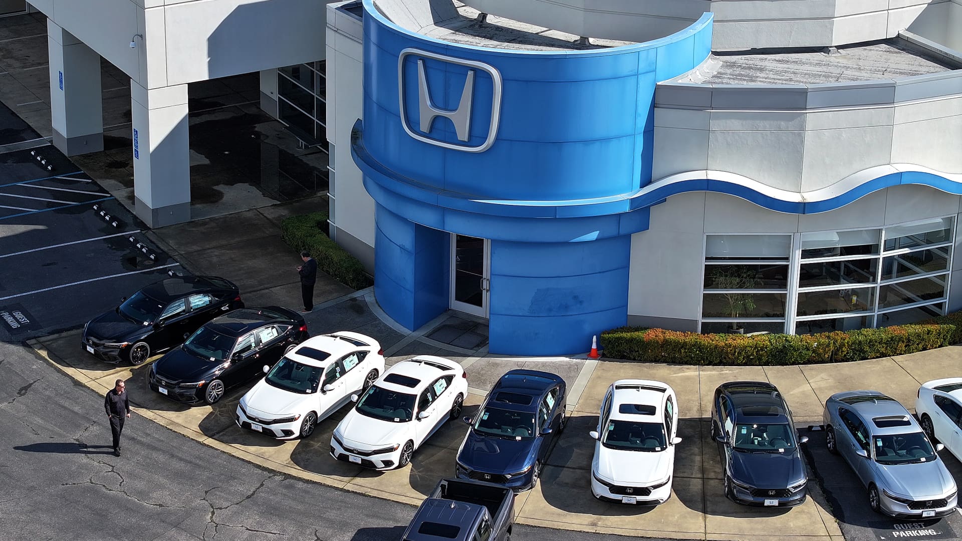 In an aerial photo, brand new Honda cars are seen on the Honda Marin dealership lot on February 6, 2024 in San Rafael, California. Honda announced the recall of 750,000 vehicles in the United States due to an airbag defect that could cause the airbags to deploy unintentionally in a collision.