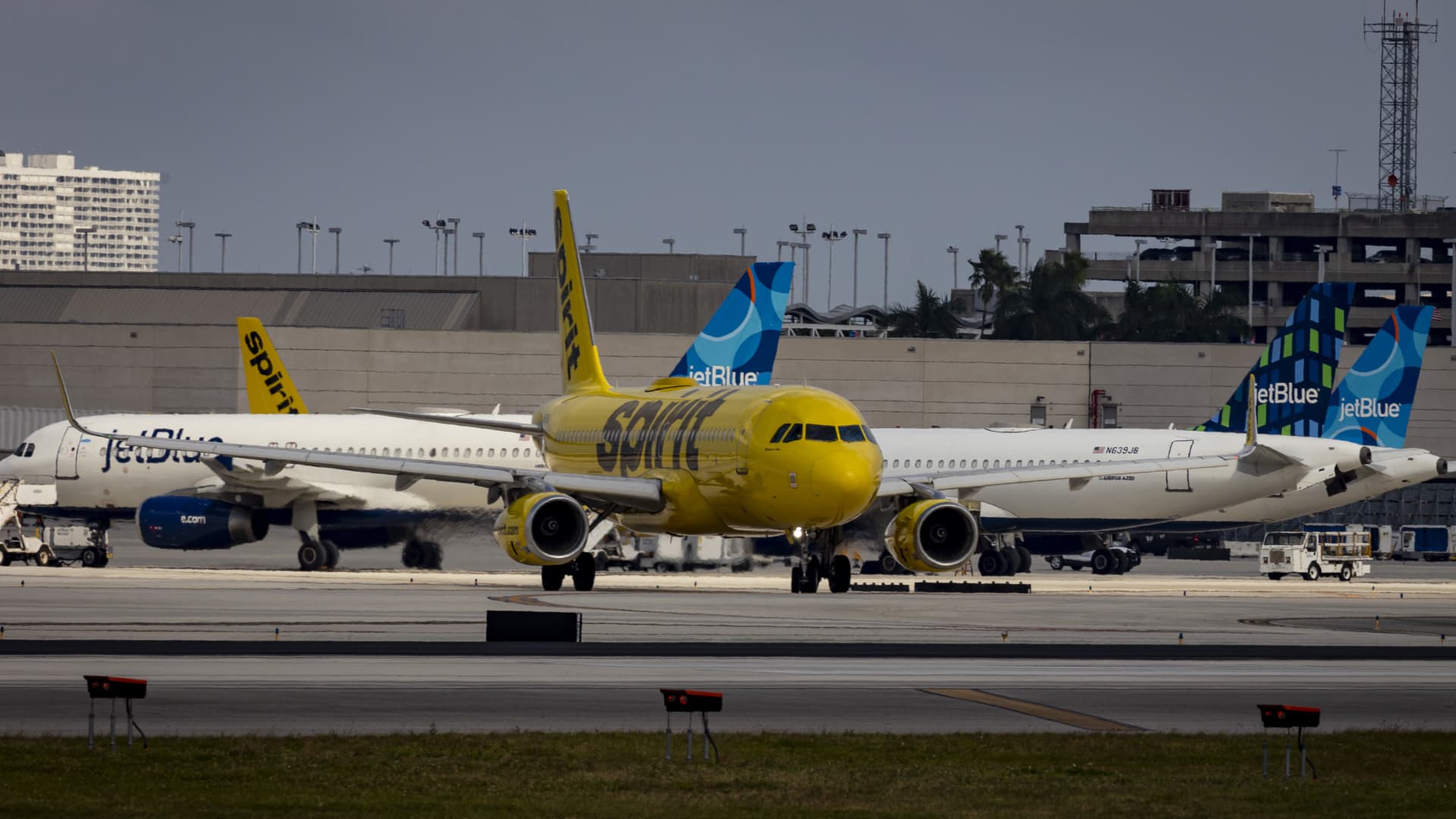 Spirit and JetBlue planes at Fort Lauderdale-Hollywood International Airport in Fort Lauderdale, Florida, on Nov. 1, 2023.