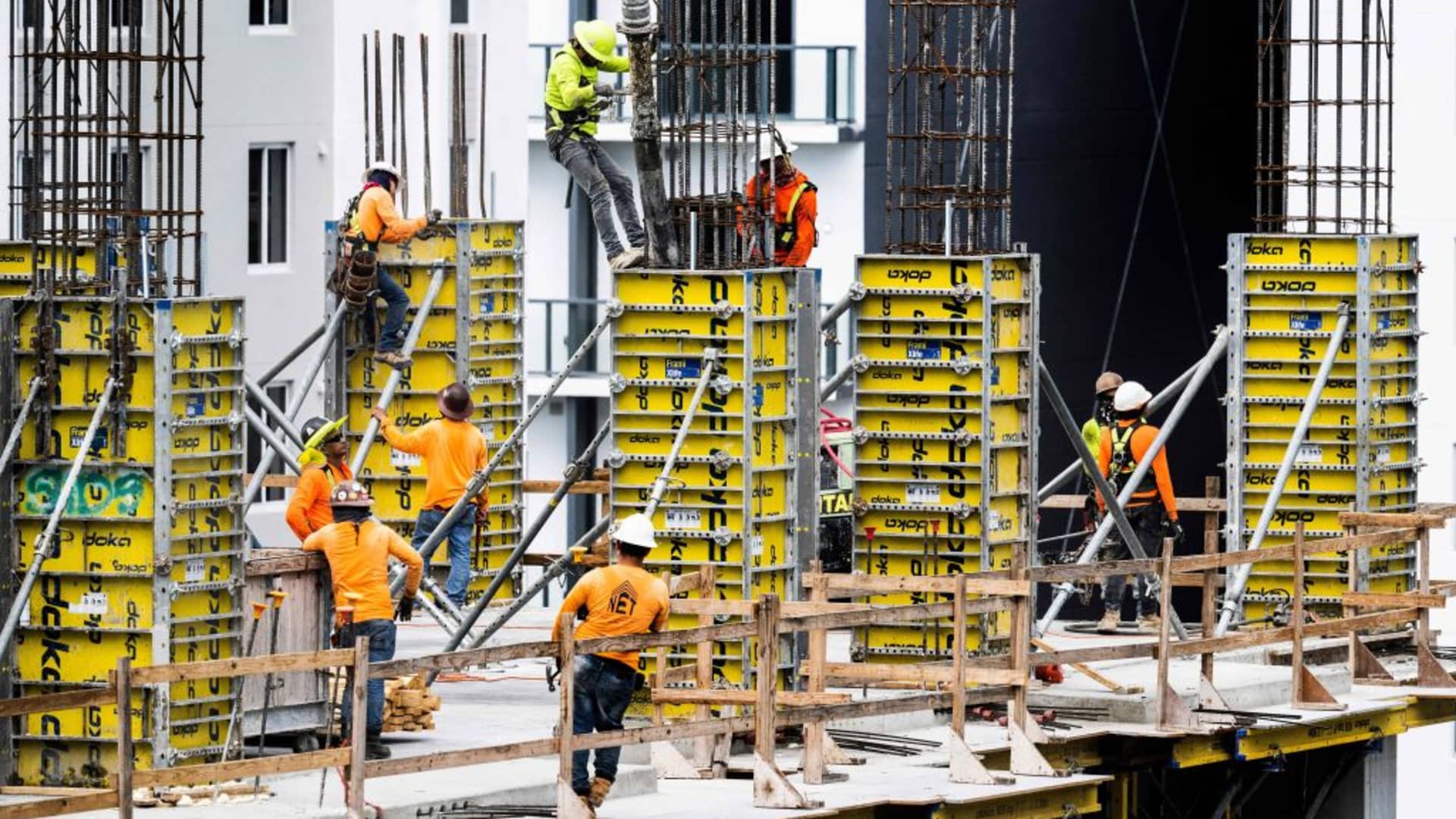 Construction workers erect a building in downtown Miami, Florida, on June 14, 2023.