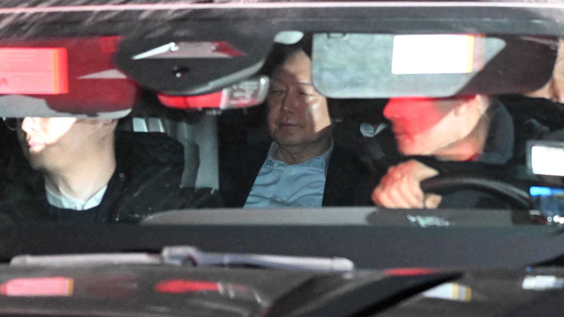 A vehicle carrying indicted South Korean President Yoon Suk Yeol (center) leaves the complex building housing the Senior Officials Corruption Investigation Office (CIO) in Gwacheon on January 15, 2025. Indicted South Korean leader Yoon Suk Yeol was arrested on Jan. 15 over his failed attempt at martial law, ending a weeks-long conflict with authorities and becoming the first sitting president to be jailed in the country's history.
