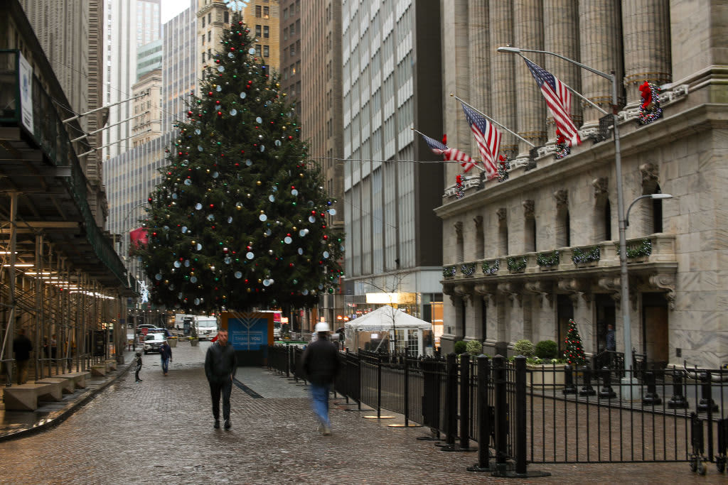 The New York Stock Exchange building is decorated for Christmas on November 30, 2020 in the Financial District of New York City, United States.