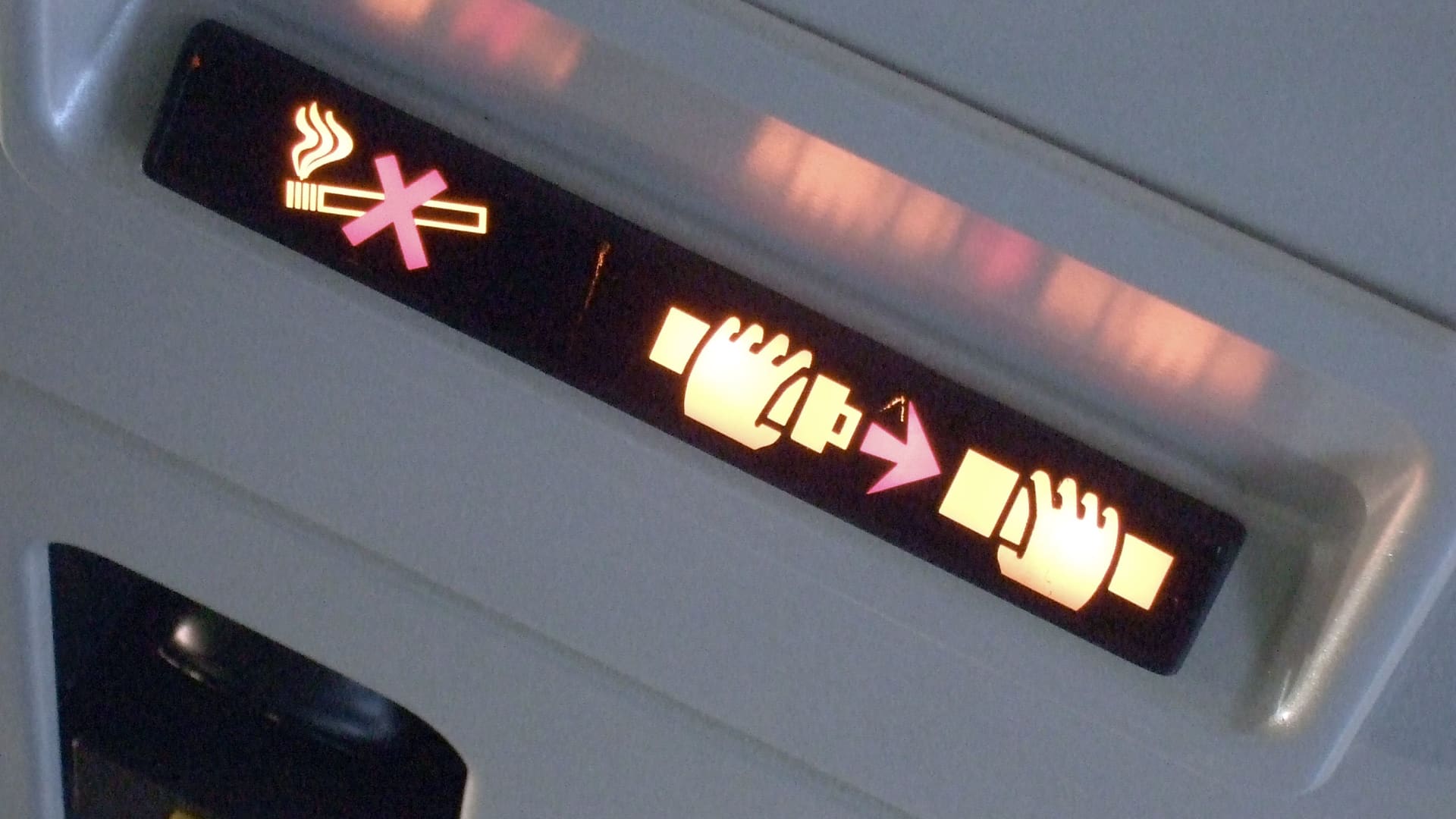 A display showing the ‘fasten your seatbelt’ sign and the ‘no smoking’ sign illuminated on board an aircraft.